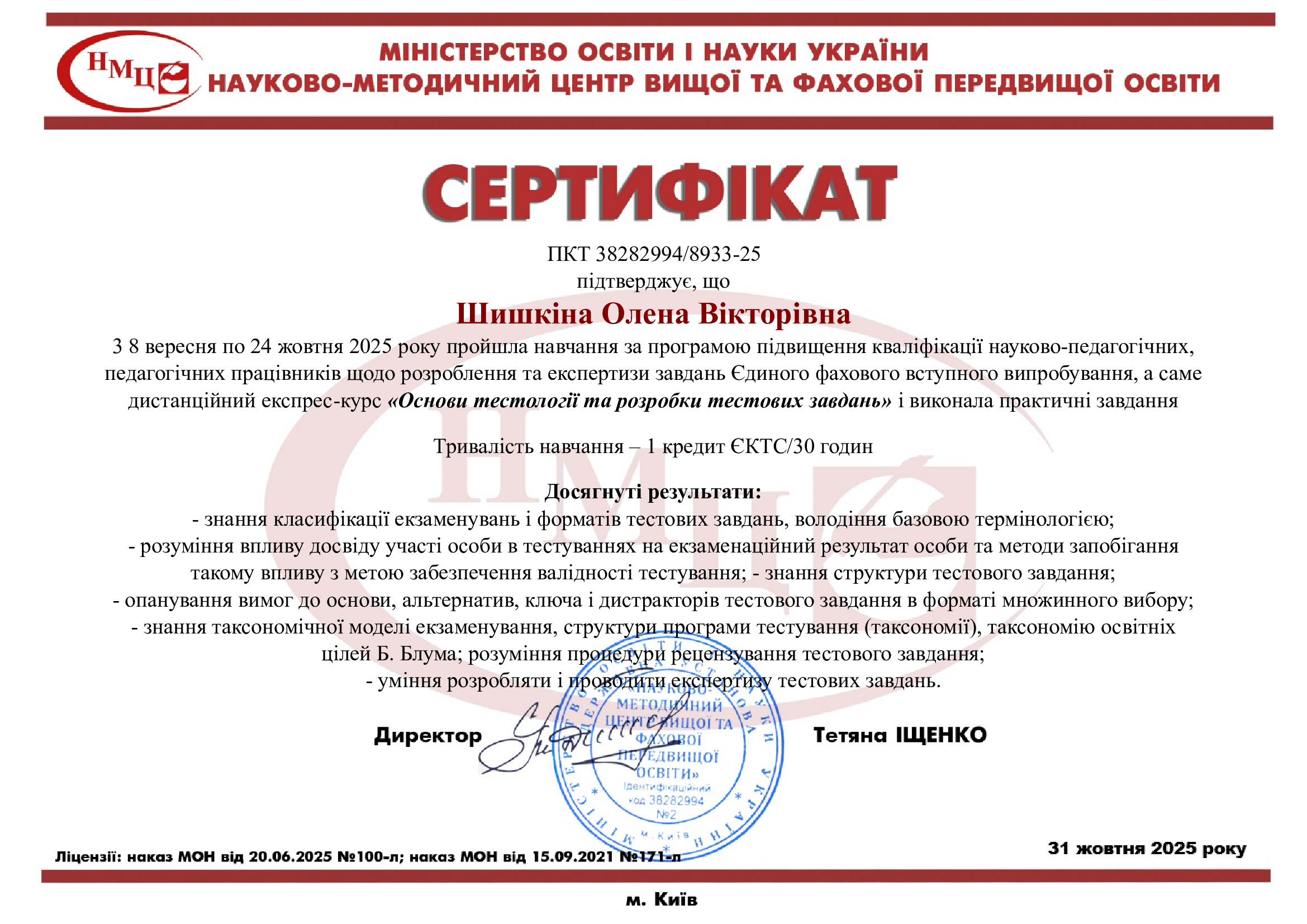 З 8 вересня по 24 жовтня 2025 року д.е.н., проф. кафедри фінансів, банківської справи та страхування Шишкіна О. В. виконала програму підвищення кваліфікації з розроблення та експертизи завдань Єдиного фахового вступного випробування, а саме пройшла дистанційний експрес-курс «Основи тестології та розробки тестових завдань» обсягом 1 кредит ЄКТС (30 годин). Програма була спрямована на підвищення кваліфікації науково-педагогічних та педагогічних працівників у сфері розробки якісних тестових завдань для вступних випробувань.