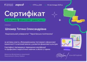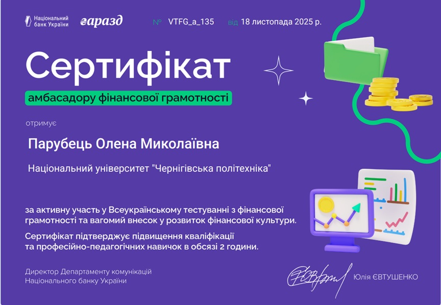 За організацію проведення на базі лабораторії «CreativeFinlab» НУ «Чернігівська політехніка» Всеукраїнського тестування з фінансової грамотності проф. О. Парубець та доц. Т. Шпомер отримали сертифікати амбосадорів з фінансової грамотності за підписом директору Департаменту комунікацій Національного банку України Ю. Євтушенко. Окрім подяки за активну участь та вагомий внесок у розвиток фінансової культури, сертифікати підтверджують підвищення кваліфікації та професійно-педагогічних навичок.