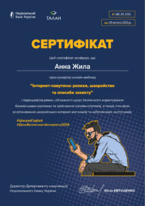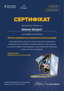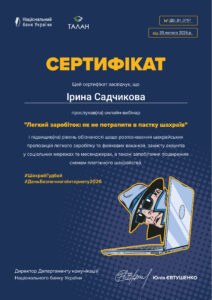 В рамках освітніх заходів до Дня безпечного Інтернету к.е.н., доцент кафедри фінансів, банківської справи та страхування Садчикова І.В. та здобувачі фахової передвищої освіти ВСП «Фаховий коледж економіки та технологій» НУ «Чернігівська політехніка» спеціальності «Маркетинг» взяли участь в онлайн-вебінарах за участю спікерів Національного банку та Кредобанку, 9 лютого 2026 р. на тему: «Легкий заробіток: як не потрапити в пастку шахраїв» та 11 лютого 2026 р. на тему: «Інтернет-павутина: ризики, шахрайство та способи захисту».