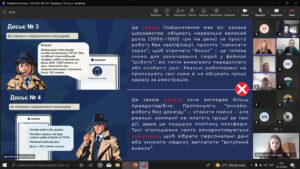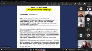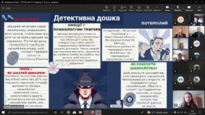 В ході виконання завдань марафону ЗВО переглянули освітній курс #ШахрайГудбай та презентацію НБУ на тему «Історія шахрайства з грошима: від фальшивомонетництва до кібершахрайства». Після цього ЗВО були поділені на команди, кожній з яких були роздані детективні справи. Команди презентували результати своєї роботи, надаючи обґрунтовані відповіді на ситуації, пов’язані з шахрайськими діями, наприкінці взяли участь у участі у грі «Вакансія чи афера? Розпізнай ризик» та «Правда чи фейк?».