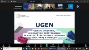 17 листопада к.е.н., доцент кафедри Тетяна Шпомер долучилася до вебінару «Єдність студентів, викладачів і роботодавців: як контент і статистика створюють ефективну взаємодію», організованого командою UGEN з метою представлення сучасних підходів до комунікації в освітньому середовищі.
