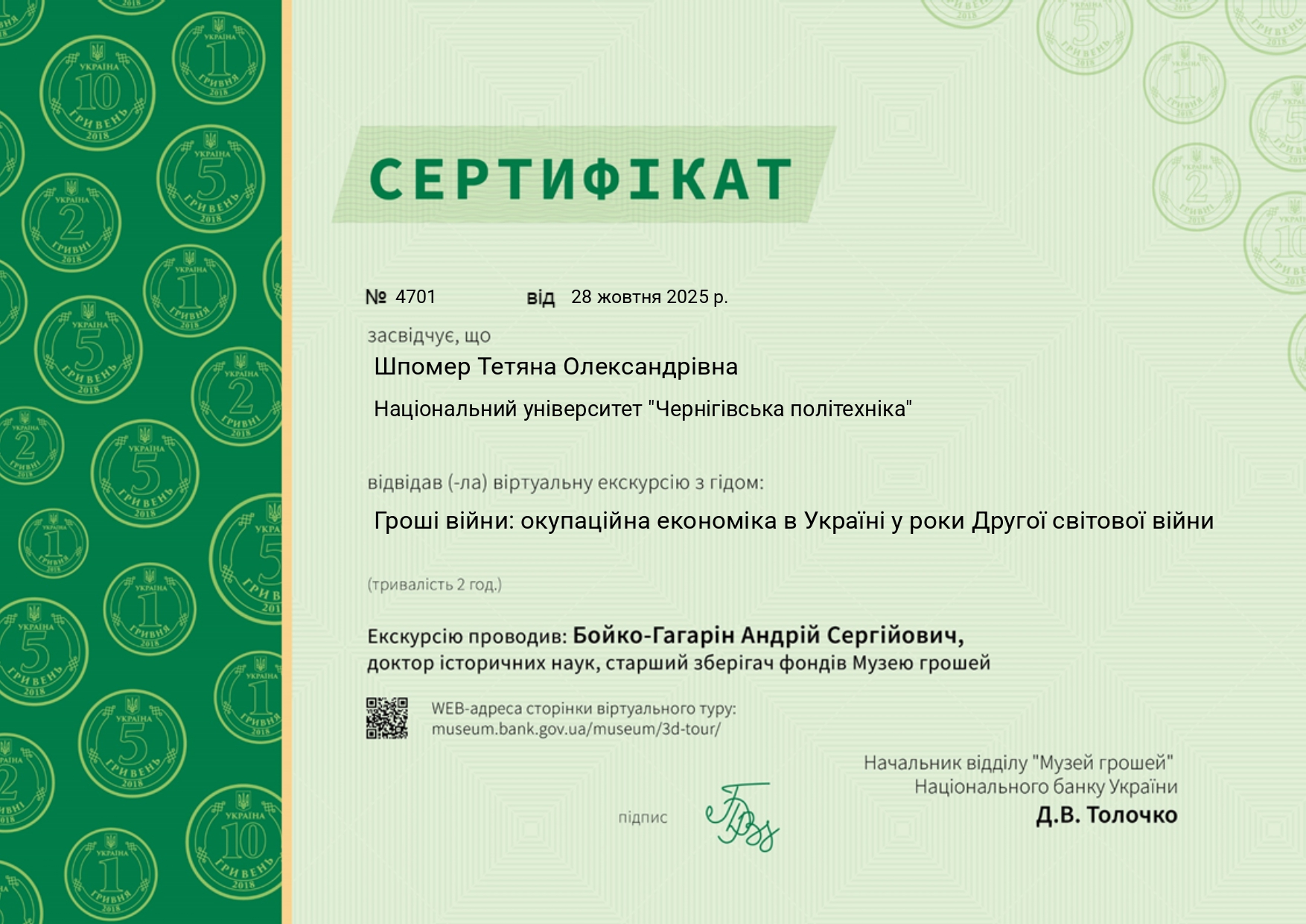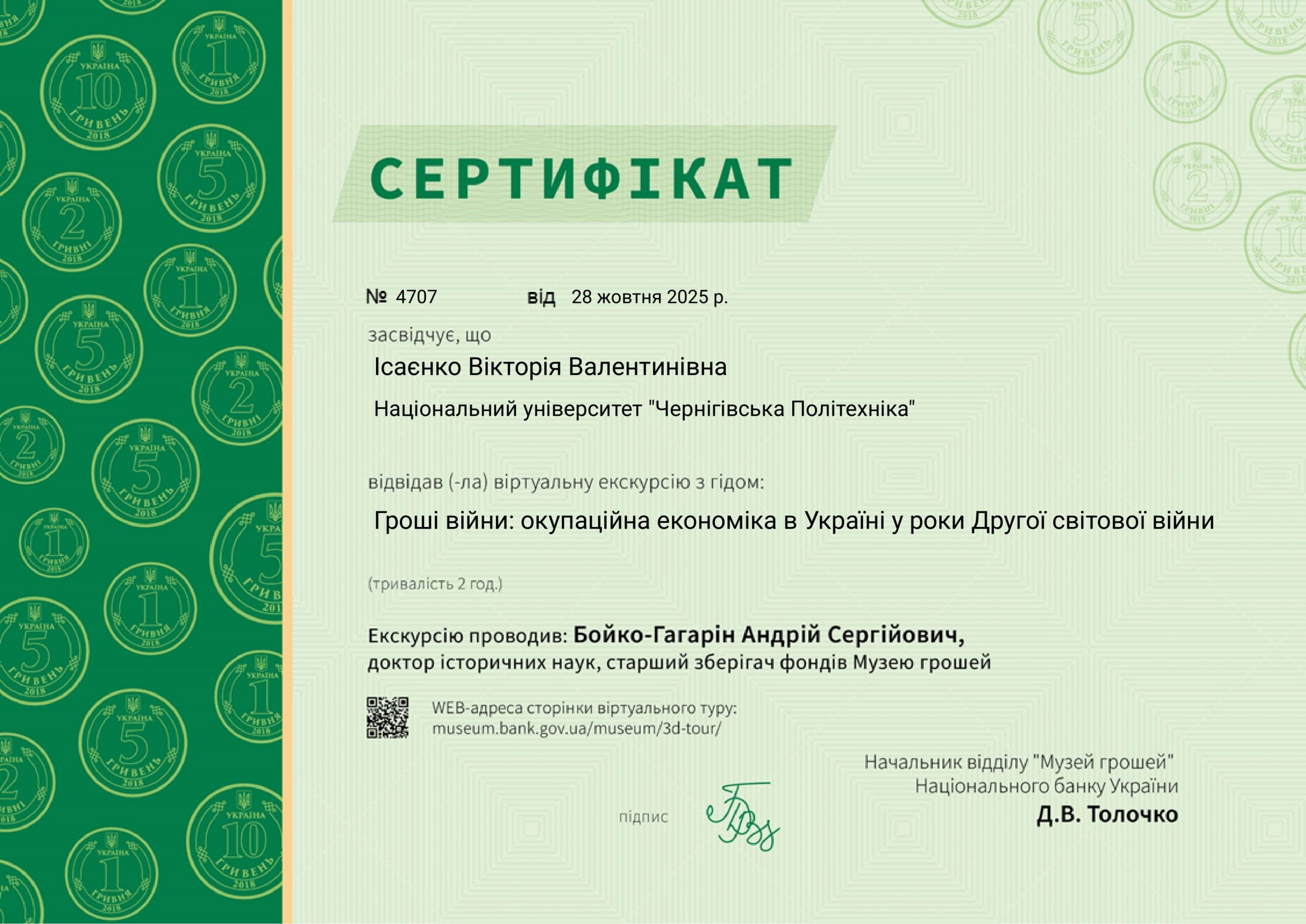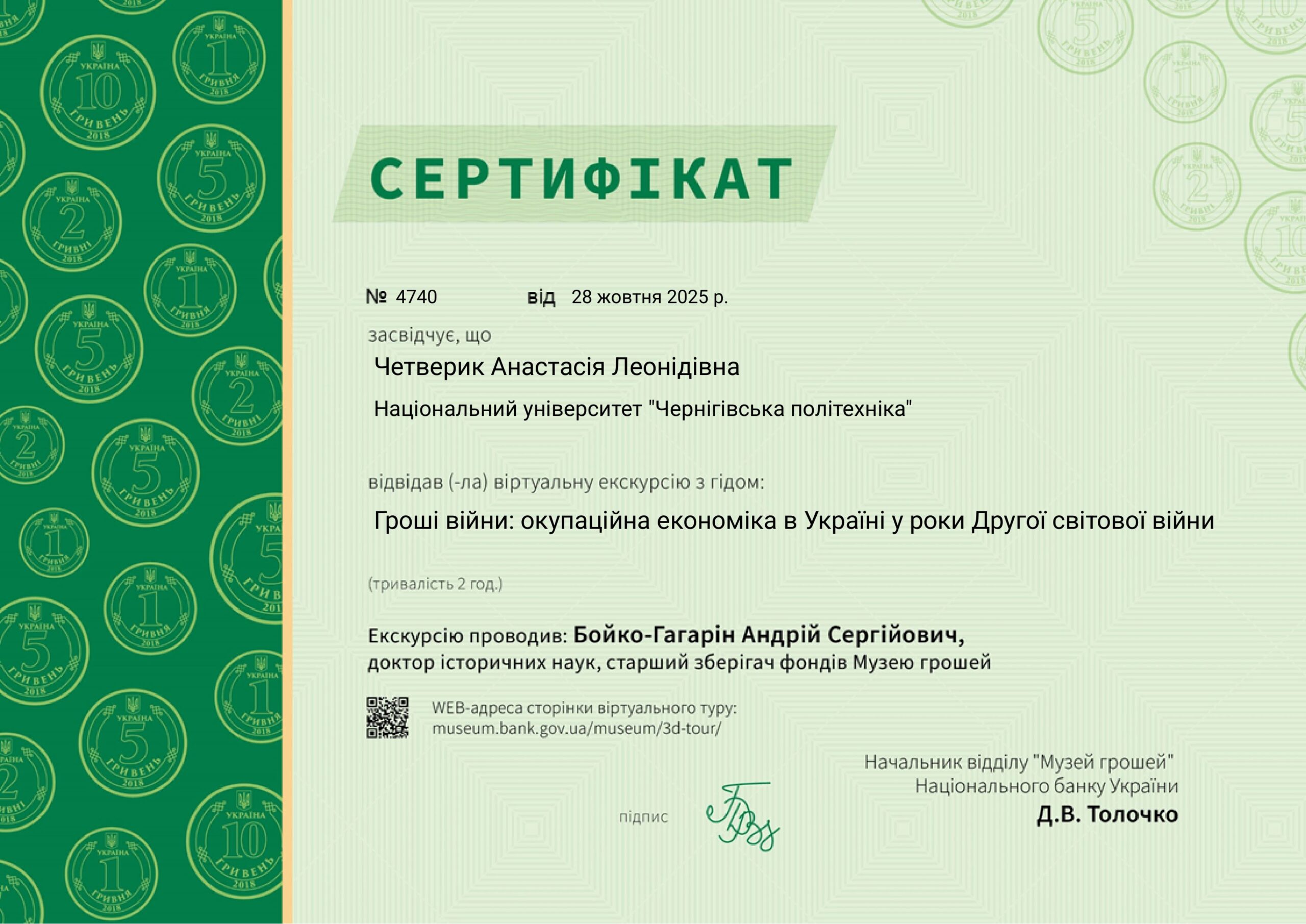 28 жовтня 2025 року викладачі кафедри фінансів, банківської справи та страхування к.е.н., доц. Кальченко О.М., д.е.н., проф. Парубець О.М., к.е.н., доц. Садчикова І.В., д.е.н., проф. Холявко Н.І., д.е.н., проф. Шишкіна О.В., к.е.н., доц. Шпомер Т.О., студенти спеціальності 072 – фінанси, банківська справа, страхування та фондовий ринок групи ФК-221 Чикаловець В., Скляр М., Чаюкова М., Рудік В., Мура Д., Ісаєнко В.; групи ФК-231 – Патлах О.; групи ФК-251 – Четверик А., Гавриляка Ю. взяли участь як слухачі у віртуальній екскурсії «Гроші війни: окупаційна економіка в Україні у роки Другої світової війни», організованої Музеєм грошей Національного банку України.