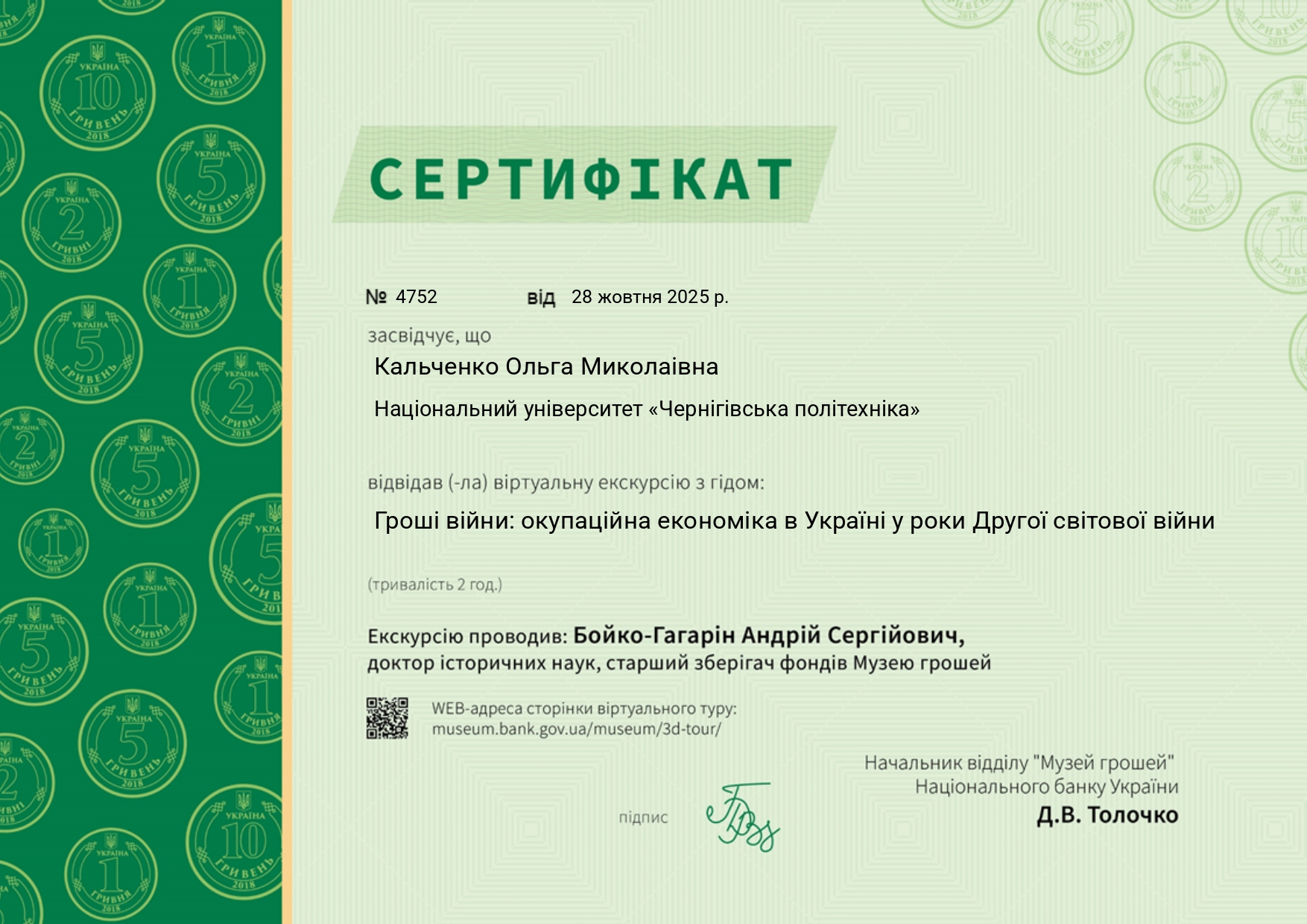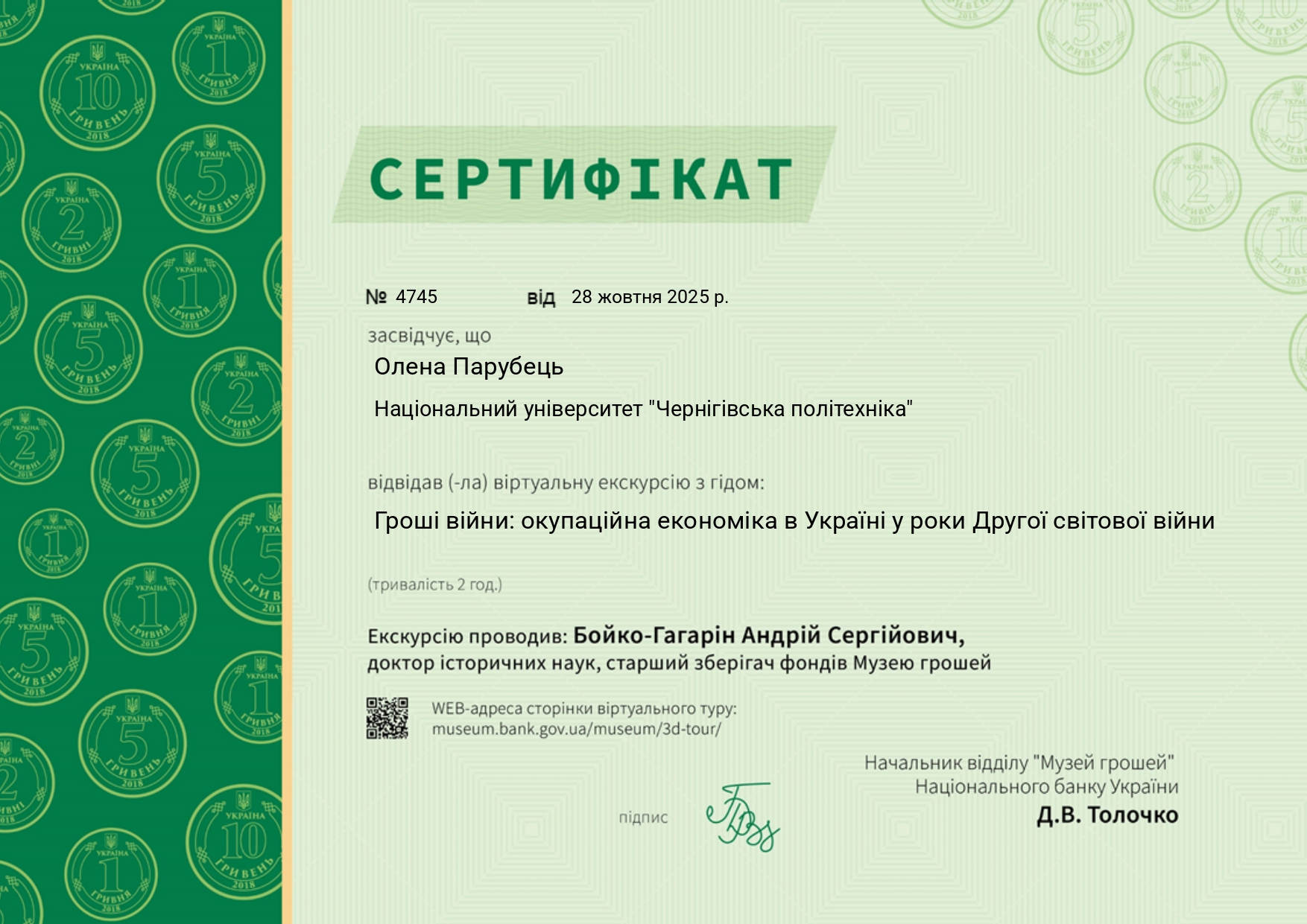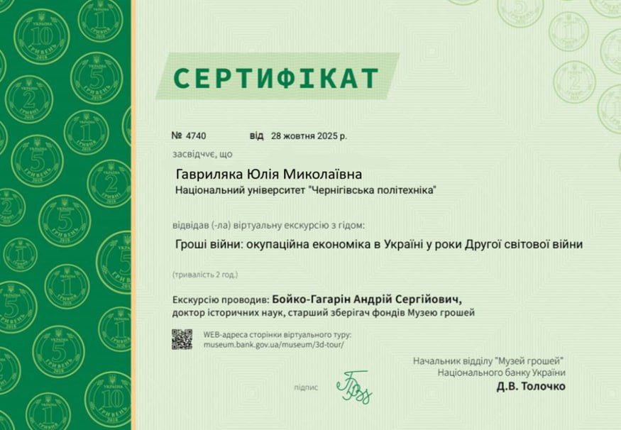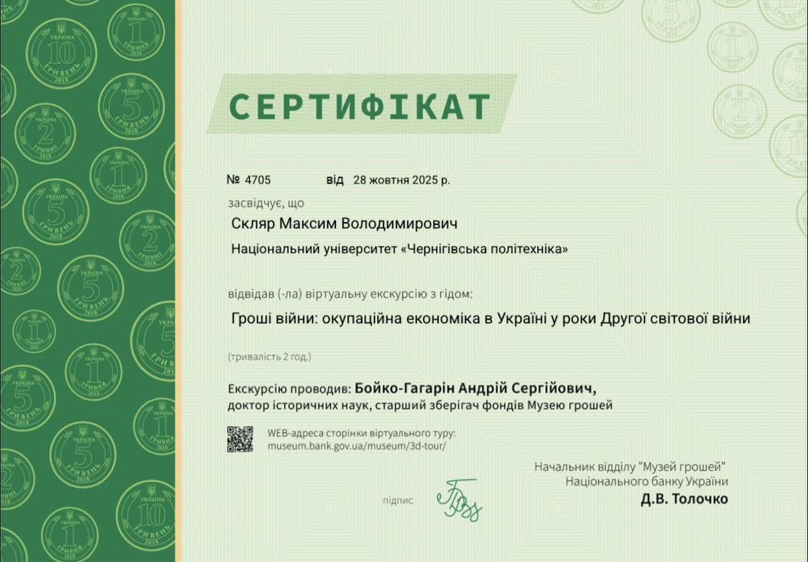 28 жовтня 2025 року викладачі кафедри фінансів, банківської справи та страхування к.е.н., доц. Кальченко О.М., д.е.н., проф. Парубець О.М., к.е.н., доц. Садчикова І.В., д.е.н., проф. Холявко Н.І., д.е.н., проф. Шишкіна О.В., к.е.н., доц. Шпомер Т.О., студенти спеціальності 072 – фінанси, банківська справа, страхування та фондовий ринок групи ФК-221 Чикаловець В., Скляр М., Чаюкова М., Рудік В., Мура Д., Ісаєнко В.; групи ФК-231 – Патлах О.; групи ФК-251 – Четверик А., Гавриляка Ю. взяли участь як слухачі у віртуальній екскурсії «Гроші війни: окупаційна економіка в Україні у роки Другої світової війни», організованої Музеєм грошей Національного банку України.