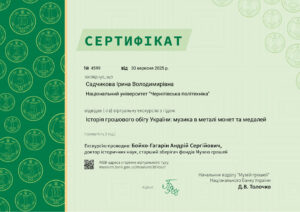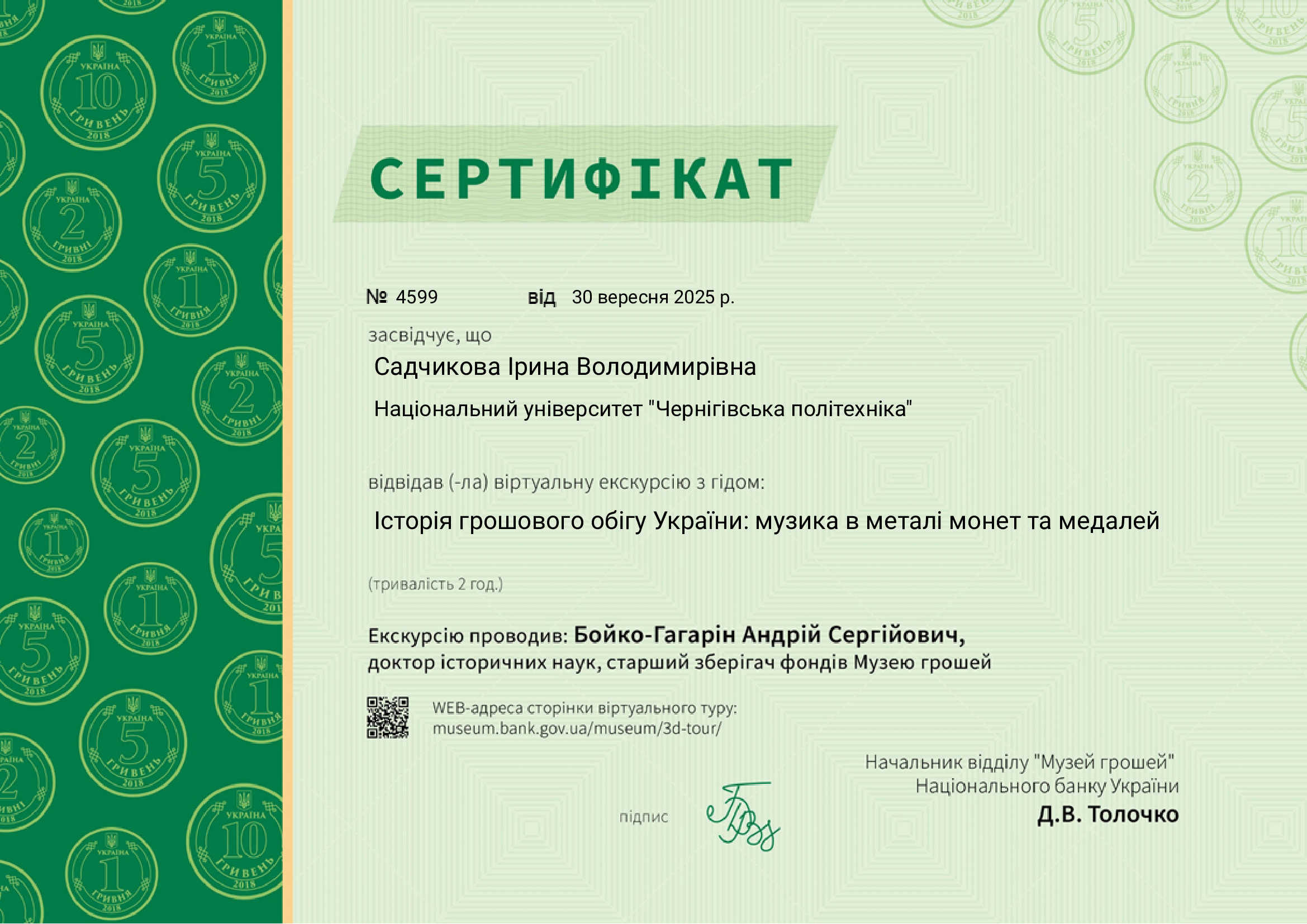 30 вересня 2025 року викладач кафедри фінансів, банківської справи та страхування к.е.н., доц. Садчикова І.В. Національного університету “Чернігівська політехніка” отримала унікальну нагоду зануритися у світ нумізматики, взявши участь у віртуальній екскурсії “Історія грошового обігу України: музика в металі монет та медалей”.