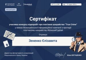 За участь в конкурсі “True Crime” сертифікати за підписом директорки Департаменту комунікацій Національного банку України Ю. Євтушенко отримали здобувачі вищої освіти: