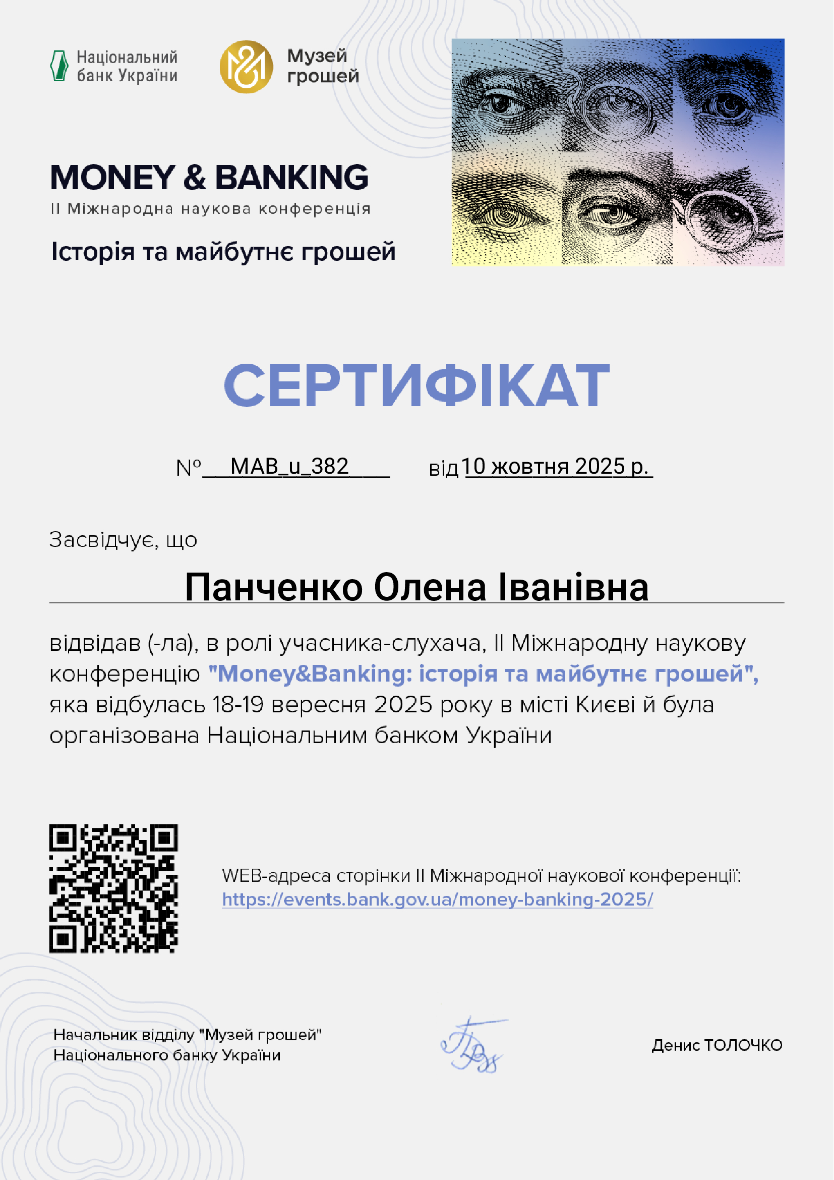 18 – 19 вересня 2025 року викладачі кафедри фінансів, банківської справи та страхування к.е.н., доц. Кальченко О.М., к.е.н., доц. Панченко О.І., д.е.н., проф. Парубець О.М., к.е.н., доц. Садчикова І.В., д.е.н., проф. Шишкіна О.В., к.е.н., доц. Шпомер Т.О., студенти спеціальності 072 – фінанси, банківська справа, страхування та фондовий ринок Андрійченко Д.В., Музиченко В.В., Патлах О.О., Самойленко А.О., Таргоній А.С. та аспіранти Фабриченко А.Г. і Шпомер А.М., взяли участь як слухачі у міжнародній науковій конференції «Money & Banking: історія та майбутнє грошей», організованій Музеєм грошей Національного банку України.